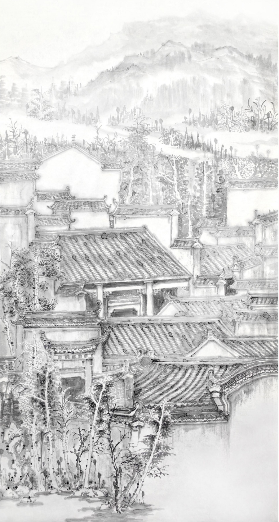 傅中良的建筑系列作品体现了自然与人文的和谐共生,他在构图中追求的不是单纯的空间表现,而是通过画面展现建筑与环境的共融关系。作品中的建筑与自然景观相得益彰,山水、树木、船只在他的笔下仿佛自然生长,与民居和徽派建筑一起构成了完整的视觉叙事。这种画面布局打破了建筑与自然的对立,使两者在水墨世界中达到了和谐统一的境界。